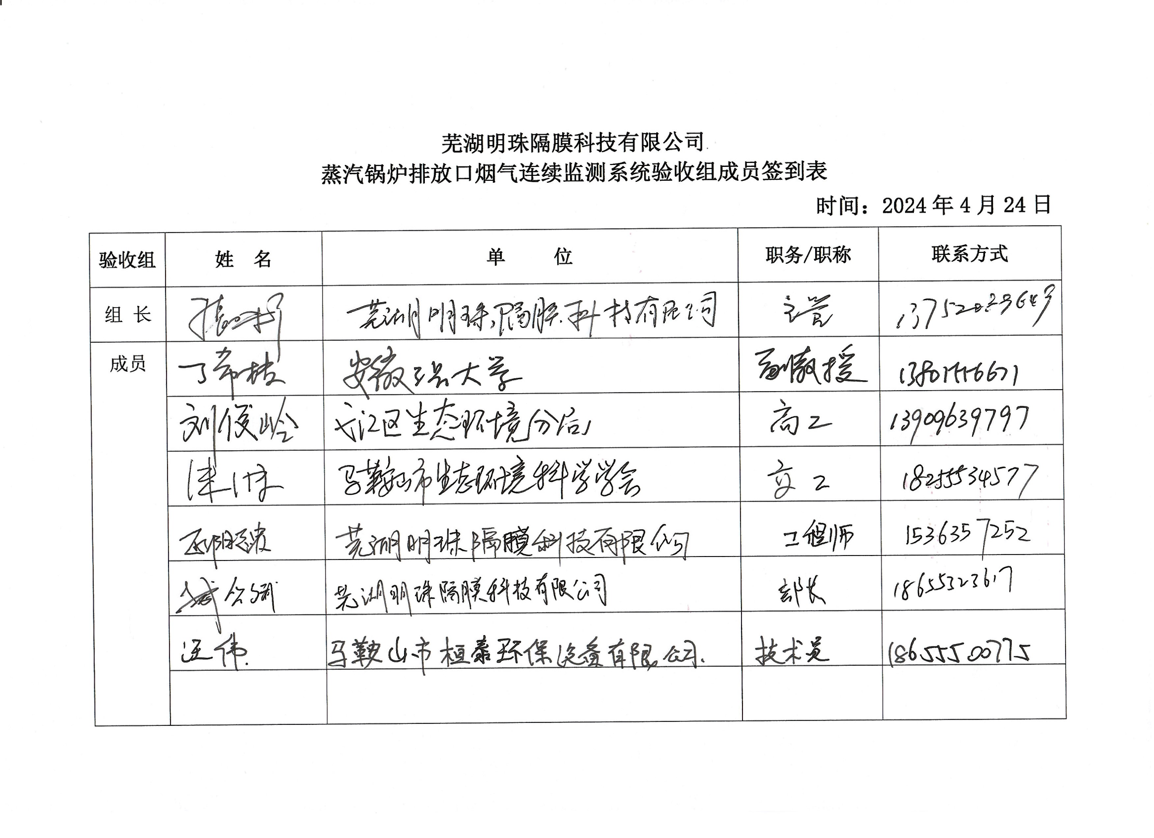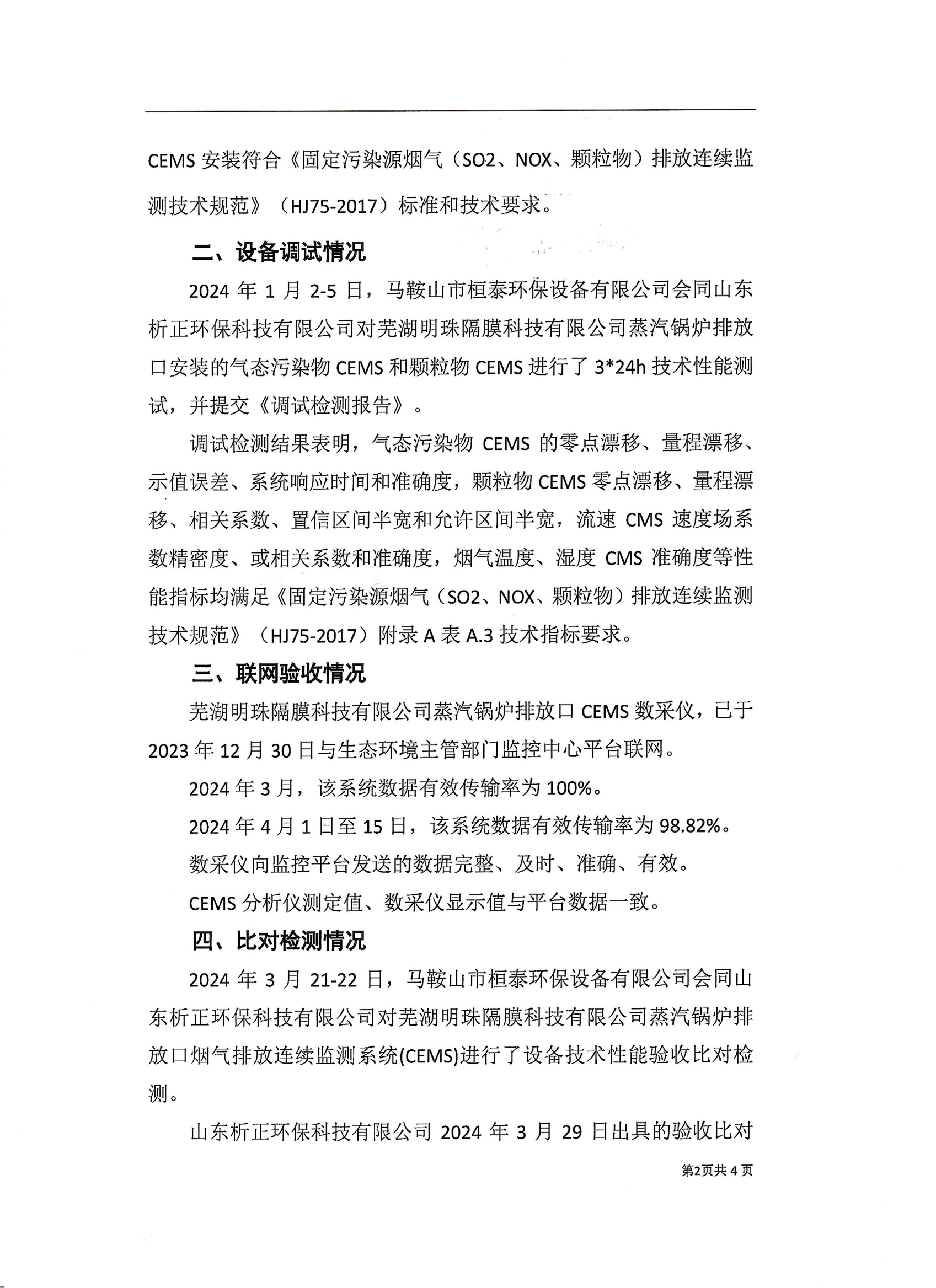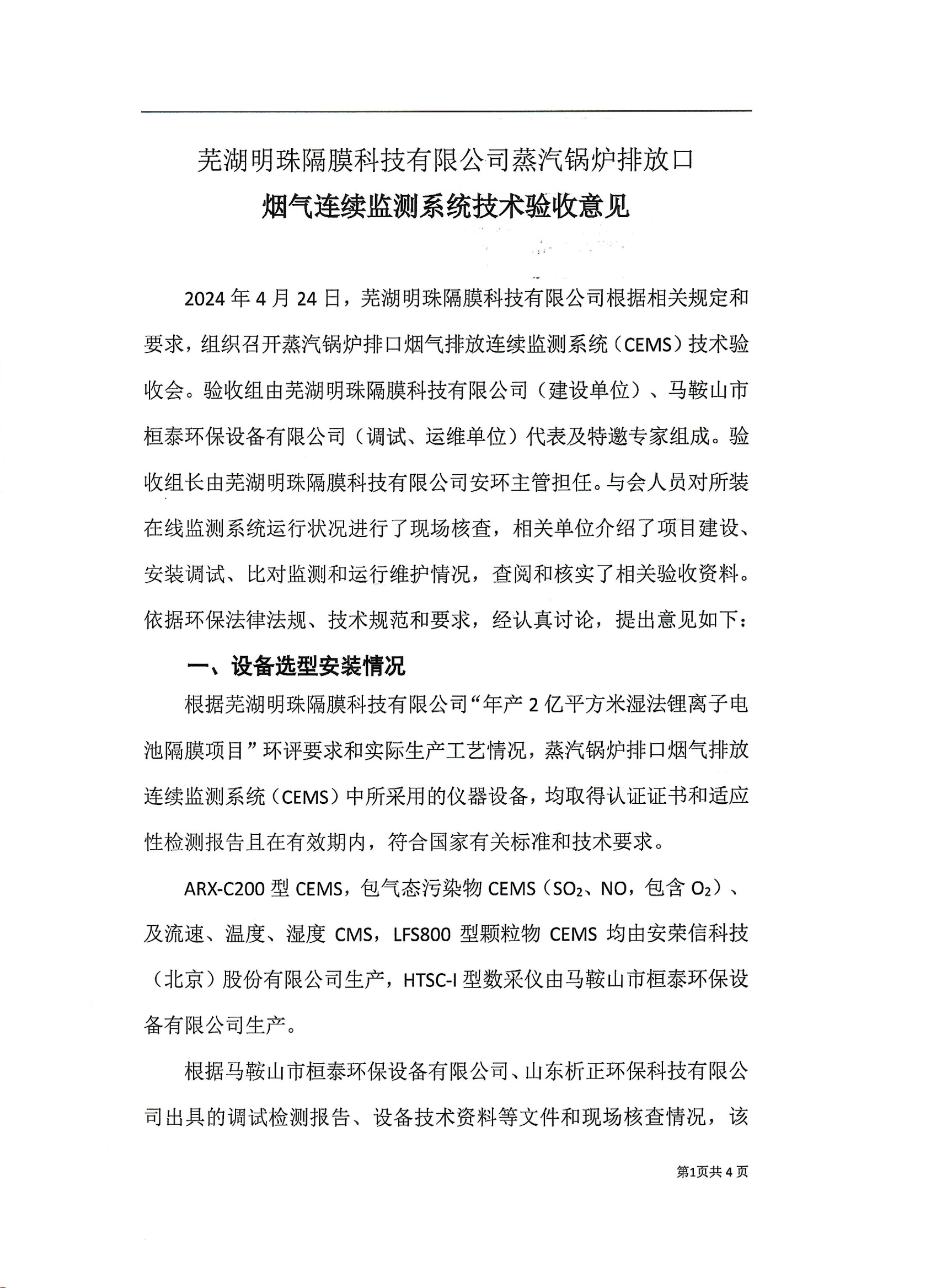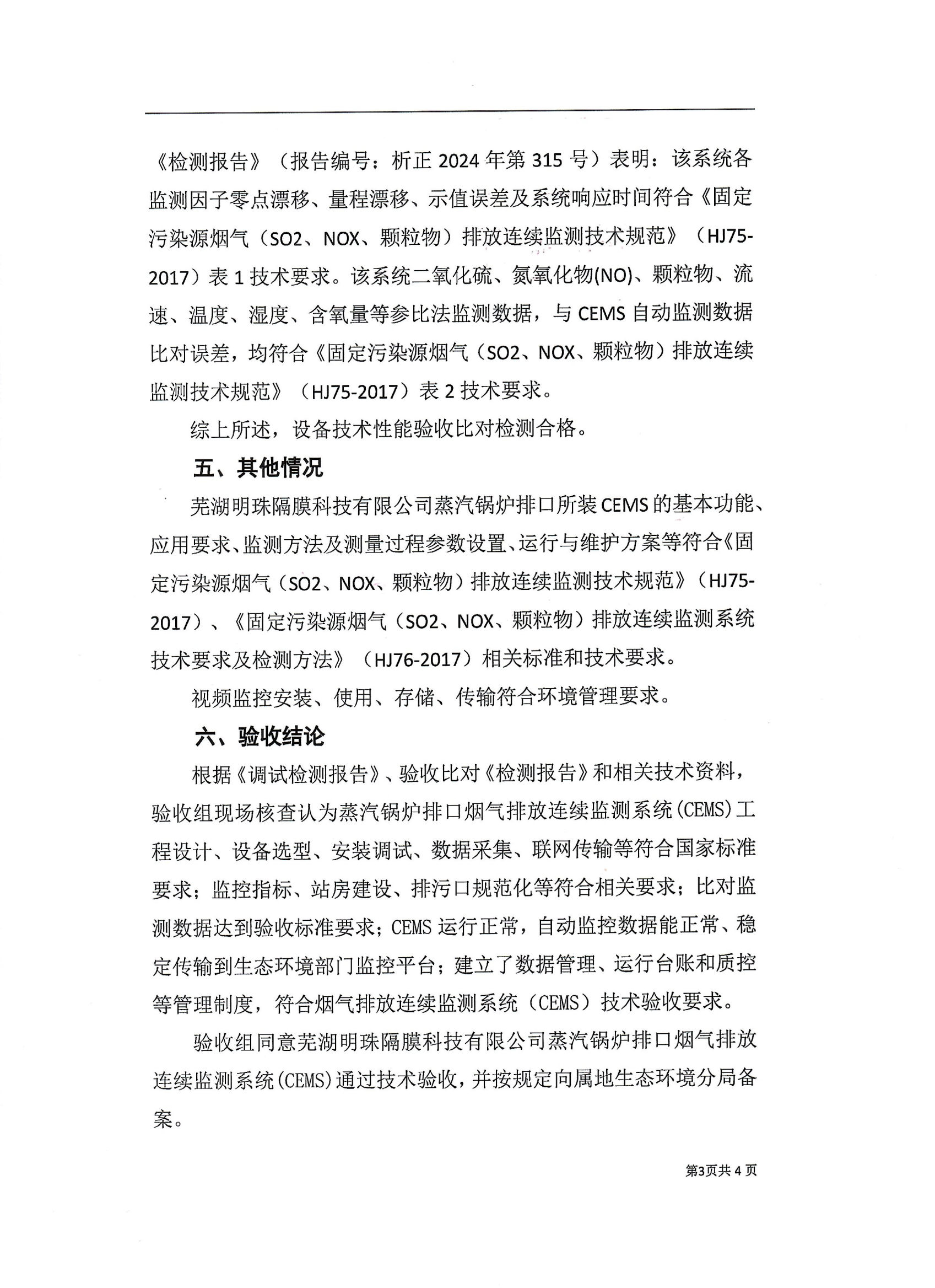 蕪湖明珠隔膜科技有限公司蒸汽鍋爐排放口煙氣連續監測系統技術驗收意見