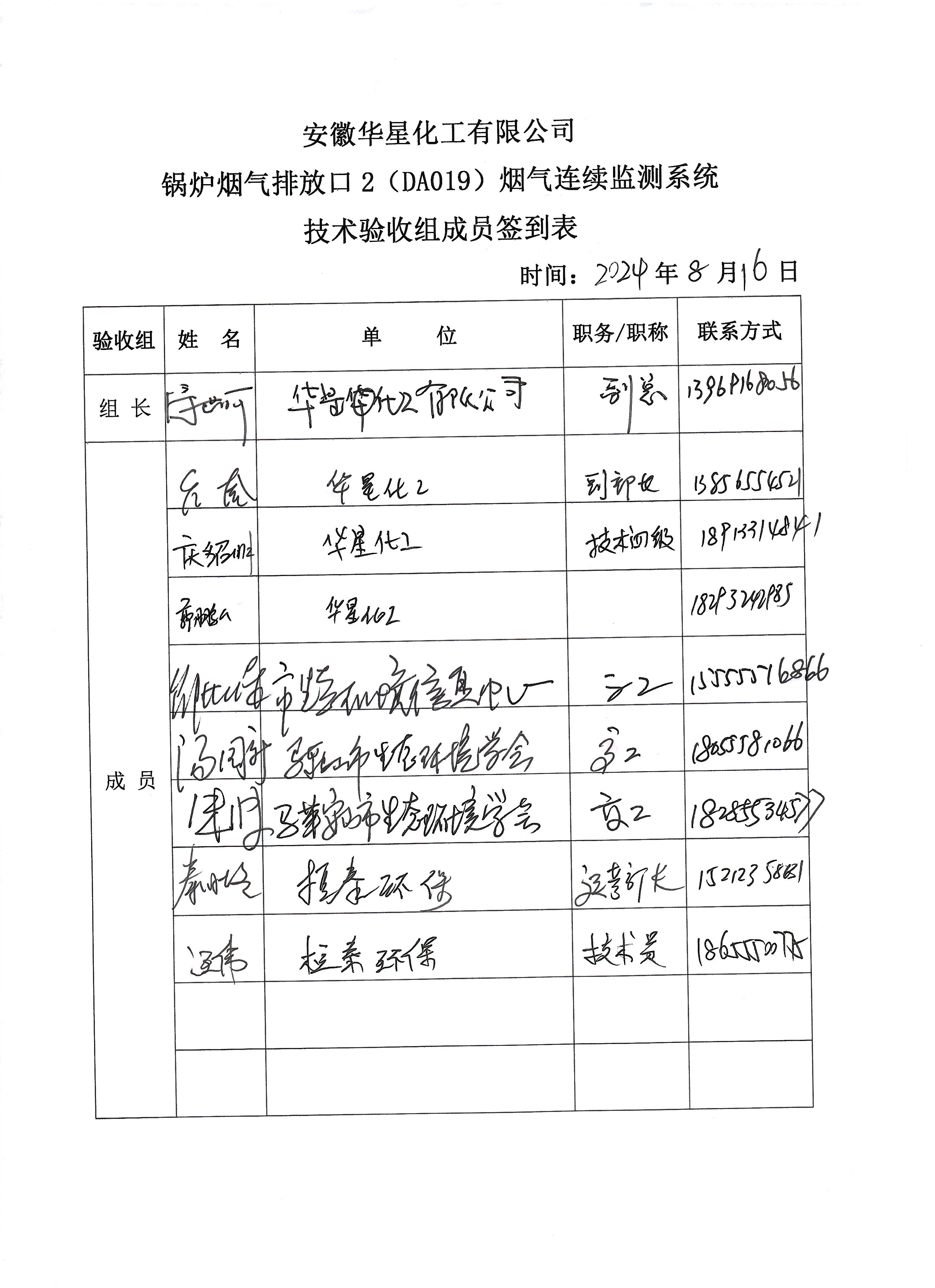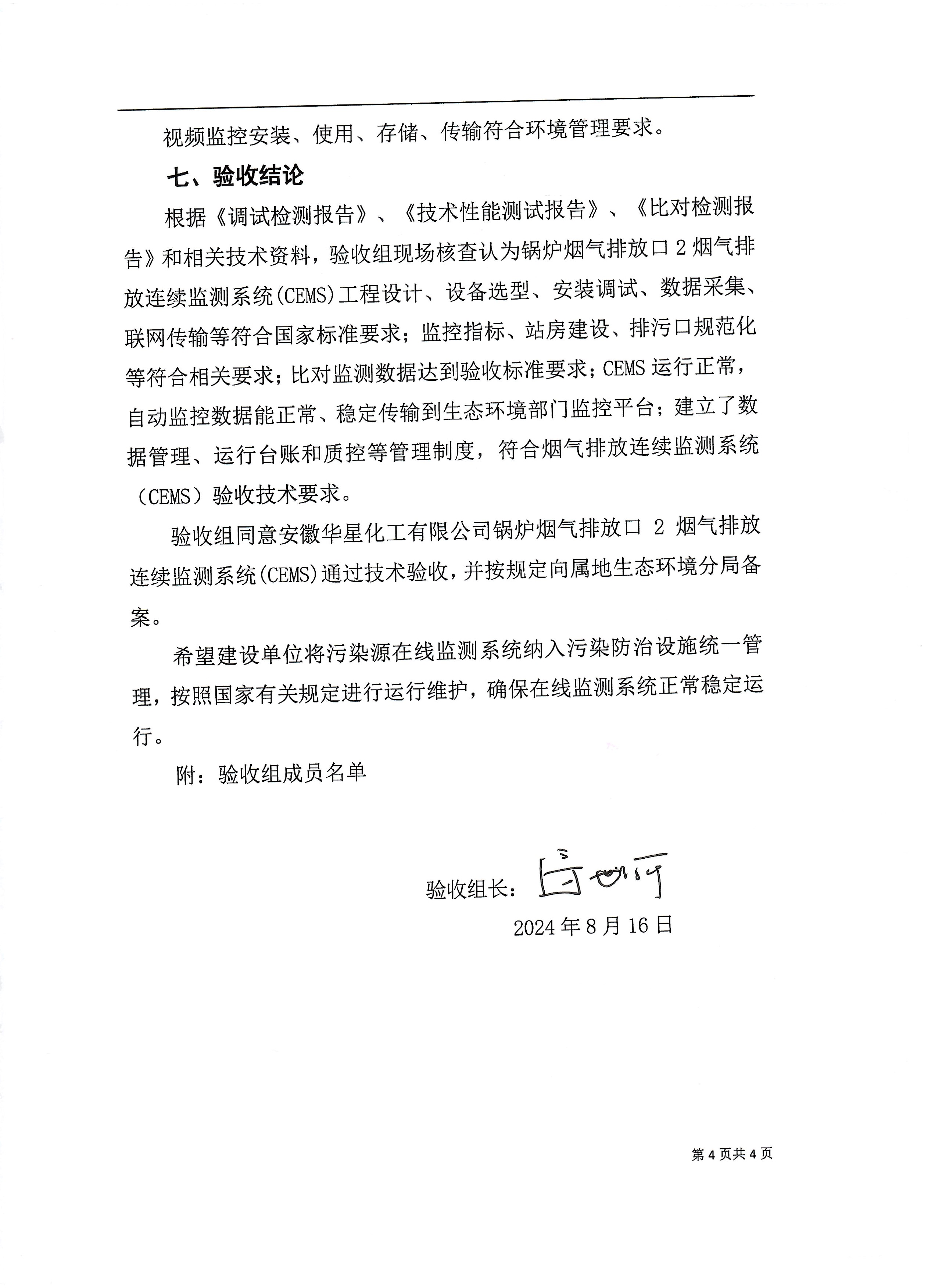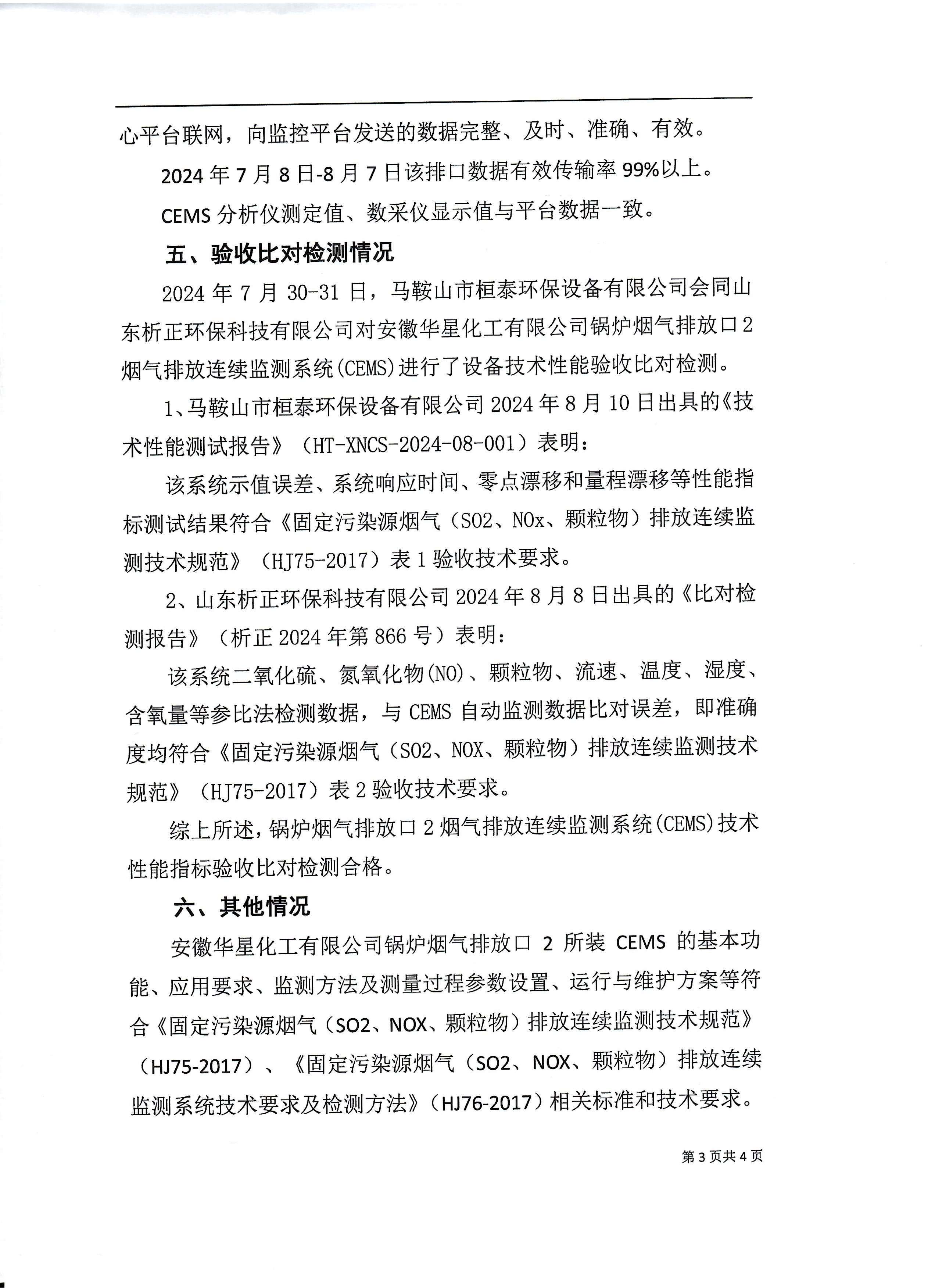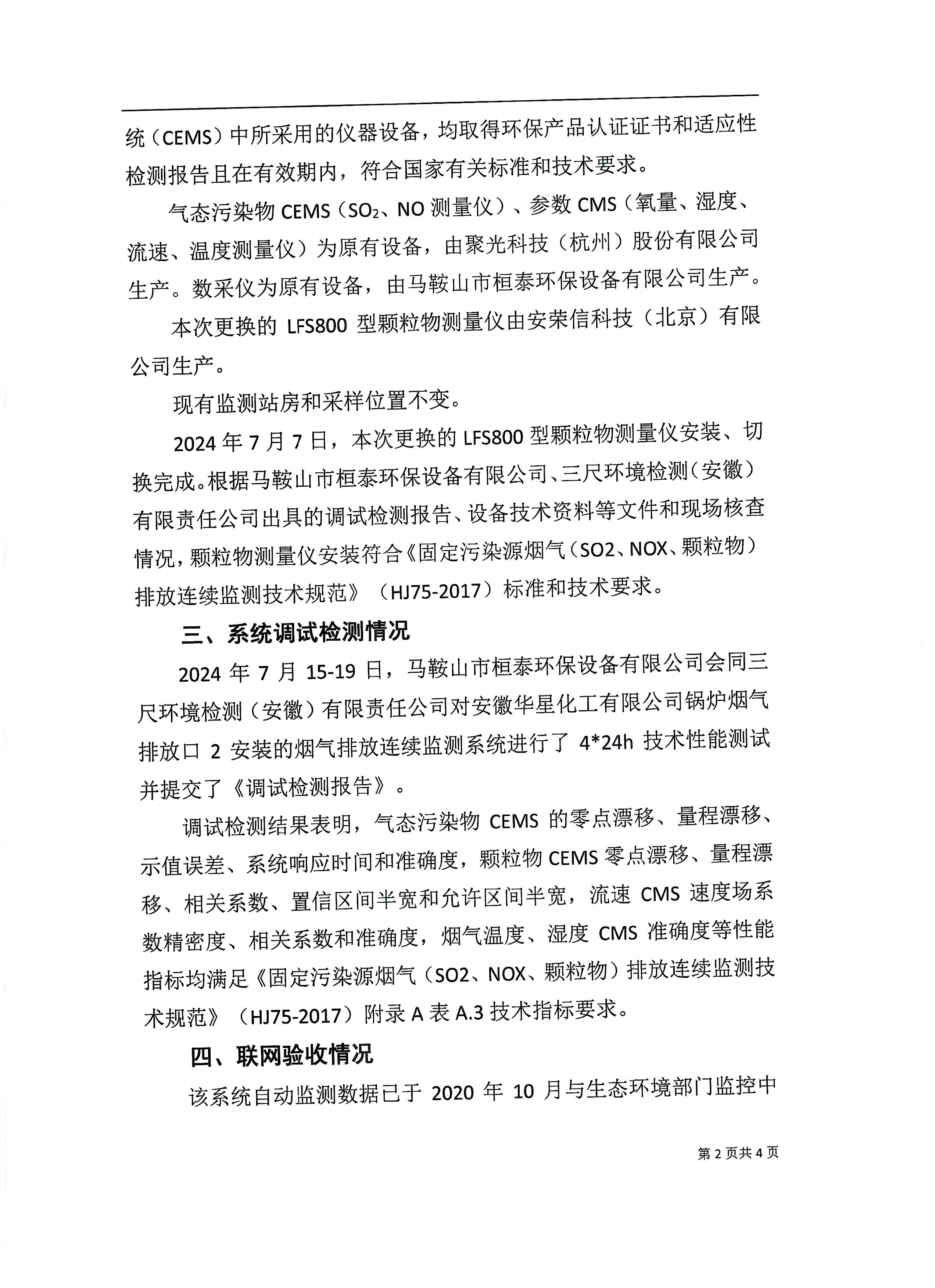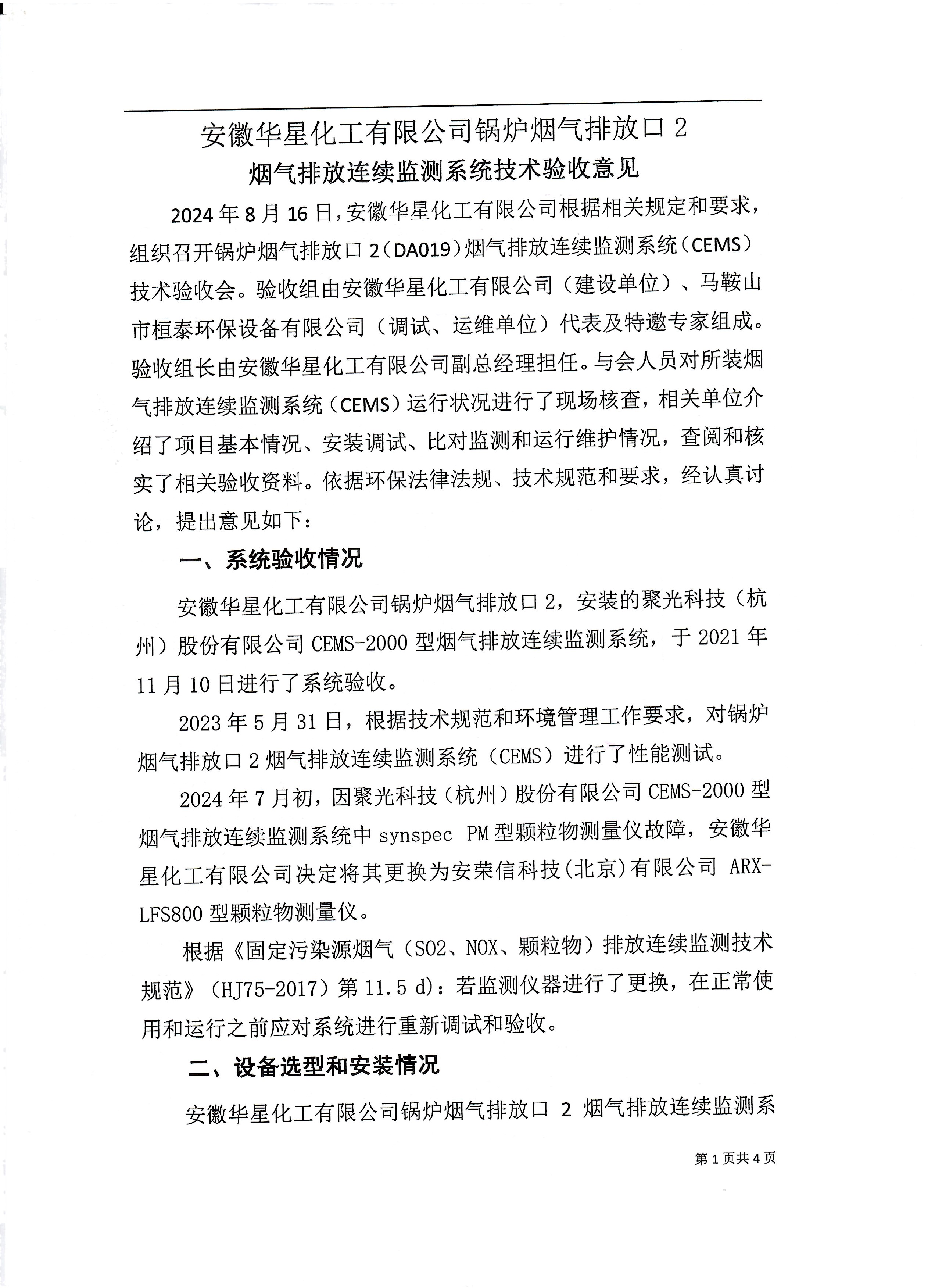安徽華星化工有限公司鍋爐煙氣排放口2煙氣排放連續監測系統技術驗收意見